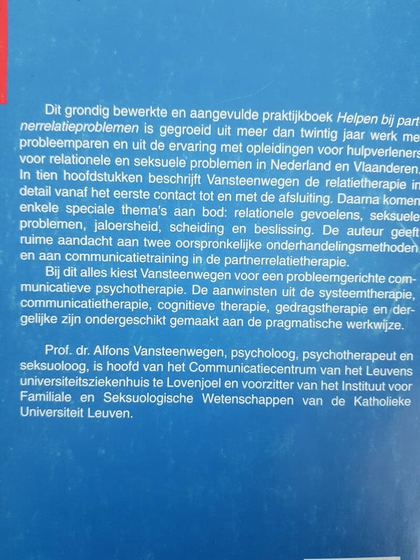 Helpen bij partnerrelatieproblemen beschrijft de relatietherapie in detail, vanaf het eerste contact tot en met de afsluiting van de behandeling. Enkele speciale thema's komen aan bod, zoals relationele gevoelens, seksuele problemen, bewuste aanvaarding en verwerking van ontrouw. De auteur geeft ruime aandacht aan twee oorspronkelijke onderhandelingsmethoden en aan de communicatietraining in de partnerrelatietherapie. Hij kiest voor een pragmatische communicatieve psychotherapie. Deze therapie integreert inzichten uit de communicatietherapie, het systeemdenken, de cognitieve therapie, de gedragstherapie en de gevoelsgerichte relatietherapie.