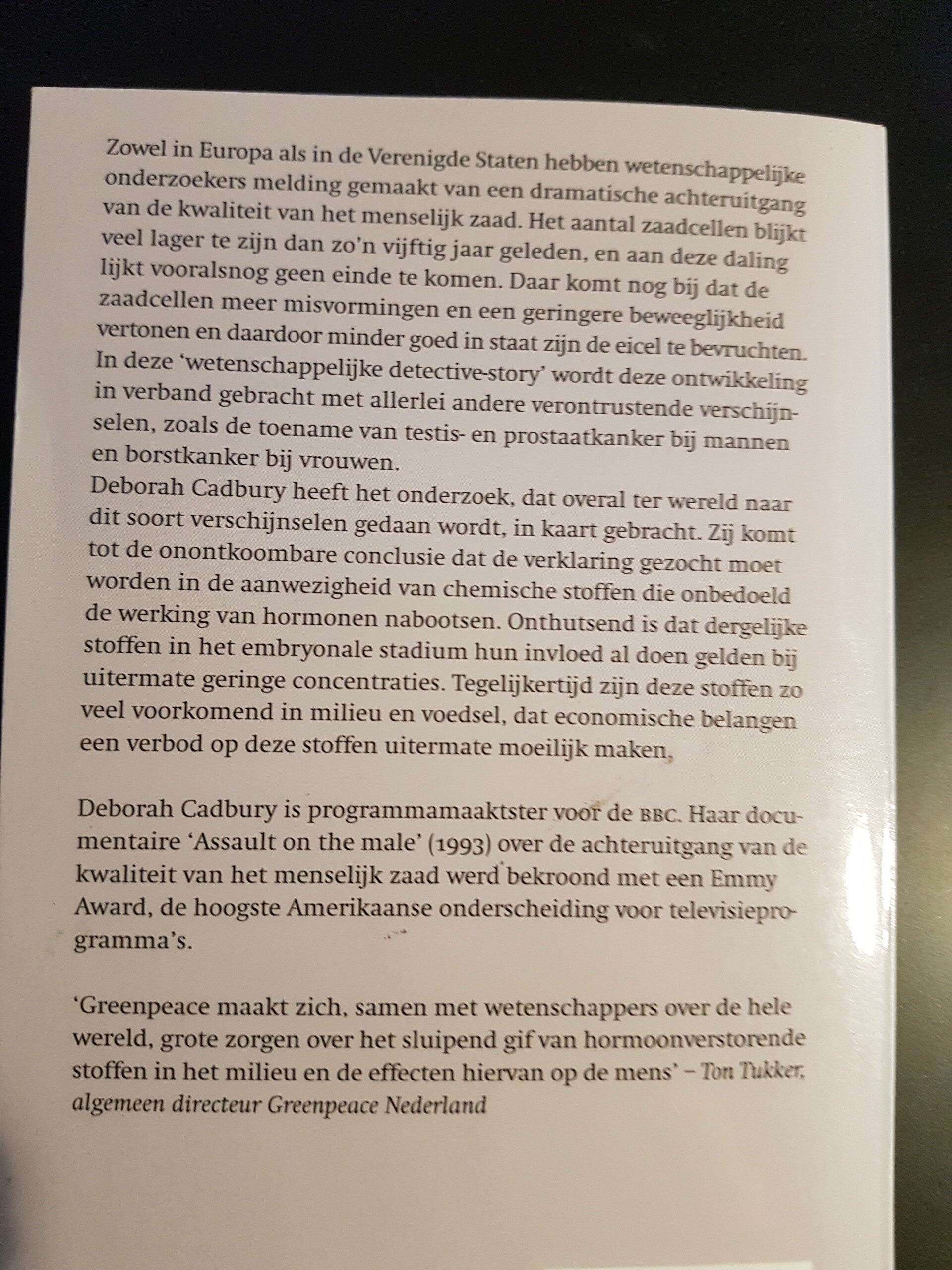 Zowel in Europa als in de Verenigde Staten hebben wetenschappelijke onderzoekers melding gemaakt van een dramatische achteruitgang van de kwaliteit van het menselijk zaad. Het aantal zaadcellen blijkt veen lager te zijn dan zo'n vijftig jaar geleden, en aan deze daling lijkt vooralsnog geen einde te komen. Daar komt nog bij dat zaadcellen meer misvormingen en een geringe beweeglijkheid vertonen en daardoor minder goed in staat zijn de eicel te bevruchten. In deze 'wetenschappelijke detective-story' wordt deze ontwikkeling in verband gebracht met allerlei andere verontrustende verschijnselen, zoals de toename van testis- en prostaatkanker bij mannen en borstkanker bij vrouwen.