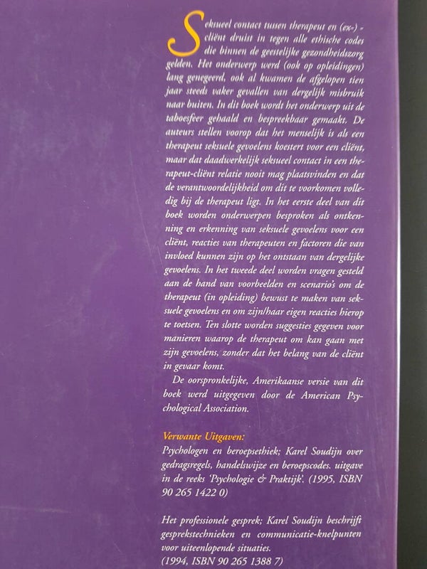 Seksueel contact tussen therapeut en (ex-)-cliënt druist in tegen alle ethische codes die binnen de geestelijke gezondheidszorg gelden. Het onderwerp werd (ook op opleidingen) lang genegeerd, ook al zijn in de loop der jaren steeds vaker gevallen van dergelijk misbruik naar buiten gekomen. In dit boek wordt het onderwerp uit de taboesfeer gehaald en bespreekbaar gemaakt. De auteurs stellen voorop dat het menselijk is als een therapeut seksuele gevoelens koestert voor een cliënt, maar dat daadwerkelijk seksueel contact in een therapeut-cliënt relatie nooit mag plaatsvinden en dat de verantwoordelijkheid om dit te voorkomen volledig bij de therapeut ligt. In het eerste deel van dit boek worden onderwerpen besproken als ontkenning en erkenning van seksuele gevoelens voor een cliënt, reacties van therapeuten en factoren die van invloed kunnen zijn op het ontstaan van dergelijke gevoelens. Het het tweede deel worden vragen gesteld aan de hand van voorbeelden en scenario's om de therapeut bewust te maken van seksuele gevoelens en om zijn/haar eigen reacties hierop te toetsen. Ten slotte worden suggesties gegeven voor manieren waarop de therapeut om kan gaan met de gevoelens, zonder dat het belang van de cliënt in gevaar komt.