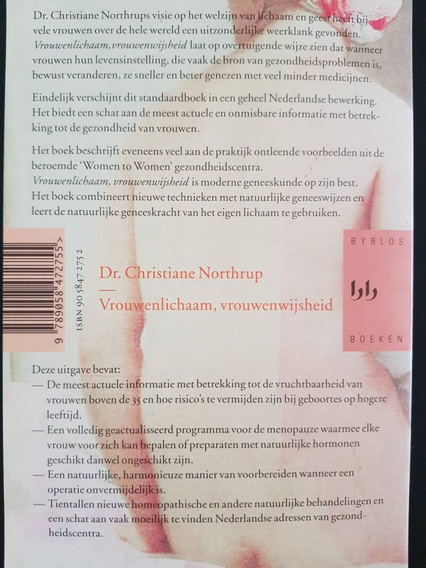 bij Bol 54 euro, bij mij voor 20 euro Dr. Christiane Northrups visie op het welzijn van lichaam en geest heeft bij vele vrouwen over de hele wereld een uitzonderlijke weerklank gevonden. Vrouwenlichaam, vrouwenwijsheid laat op overtuigende wijze zien dat wanneer vrouwen hun levensinstelling, die vaak de bron van gezondheidsproblemen is, bewust veranderen, ze sneller en beter genezen met veel minder medicijnen. In het hulpboek komen vragen aan de orde, zoals hoe u de juiste specialist kan vinden voor een bepaalde kwaal, of hoe u bij een bepaalde ziekte het juiste menu kunt samenstellen.