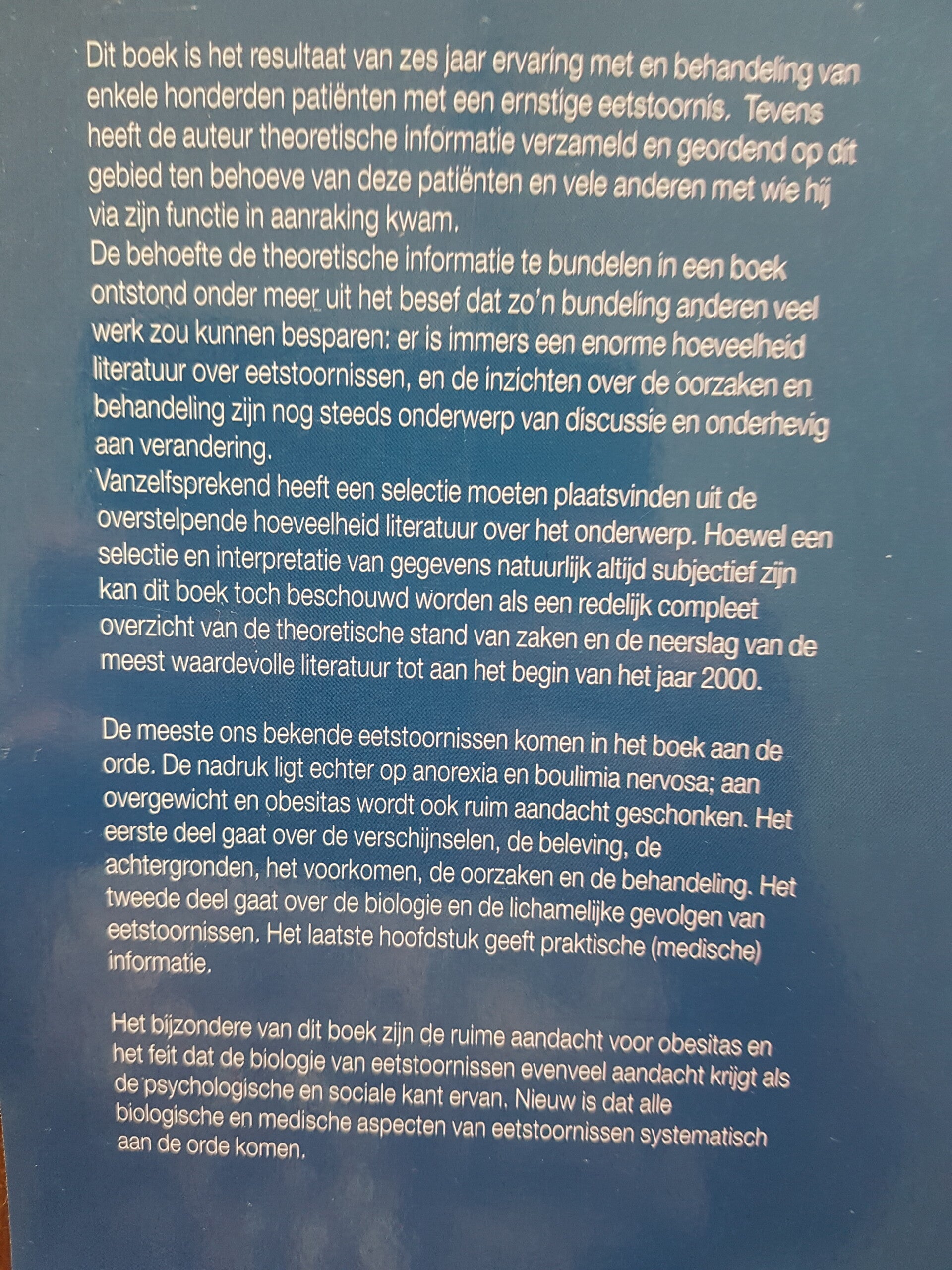 Dit boek is het resultaat van zes jaar ervaring met en behandeling van enkele honderden patiënten met een ernstige eetstoornis. Tevens heeft de auteur theoretische informatie verzameld en geordend op dit gebied ten behoeve van deze patiënten en vele anderen met wie hij via zijn functie in aanraking kwam. De nadruk ligt op anorexia en boulimia nervosa. Aan overgewicht en obesitas wordt ook ruim aandacht geschonken. Het eerste deel gaat over de verschijnselen, de beleving, de achtergronden, het voorkomen, de oorzaken en de behandeling. Het tweede deel gaat over de biologie en de lichamelijke gevolgen van eetstoornissen. Het laatste hoofdstuk geeft praktische (medische) informatie. Het bijzondere van dit boek zijn de ruime aandacht voor obesitas en het feit dat de biologie van eetstoornissen evenveel aandacht krijgt als de psychologische en sociale kant ervan. Nieuw is dat alle biologische en medische aspecten van eetstoornissen systematisch aan de orde komen.