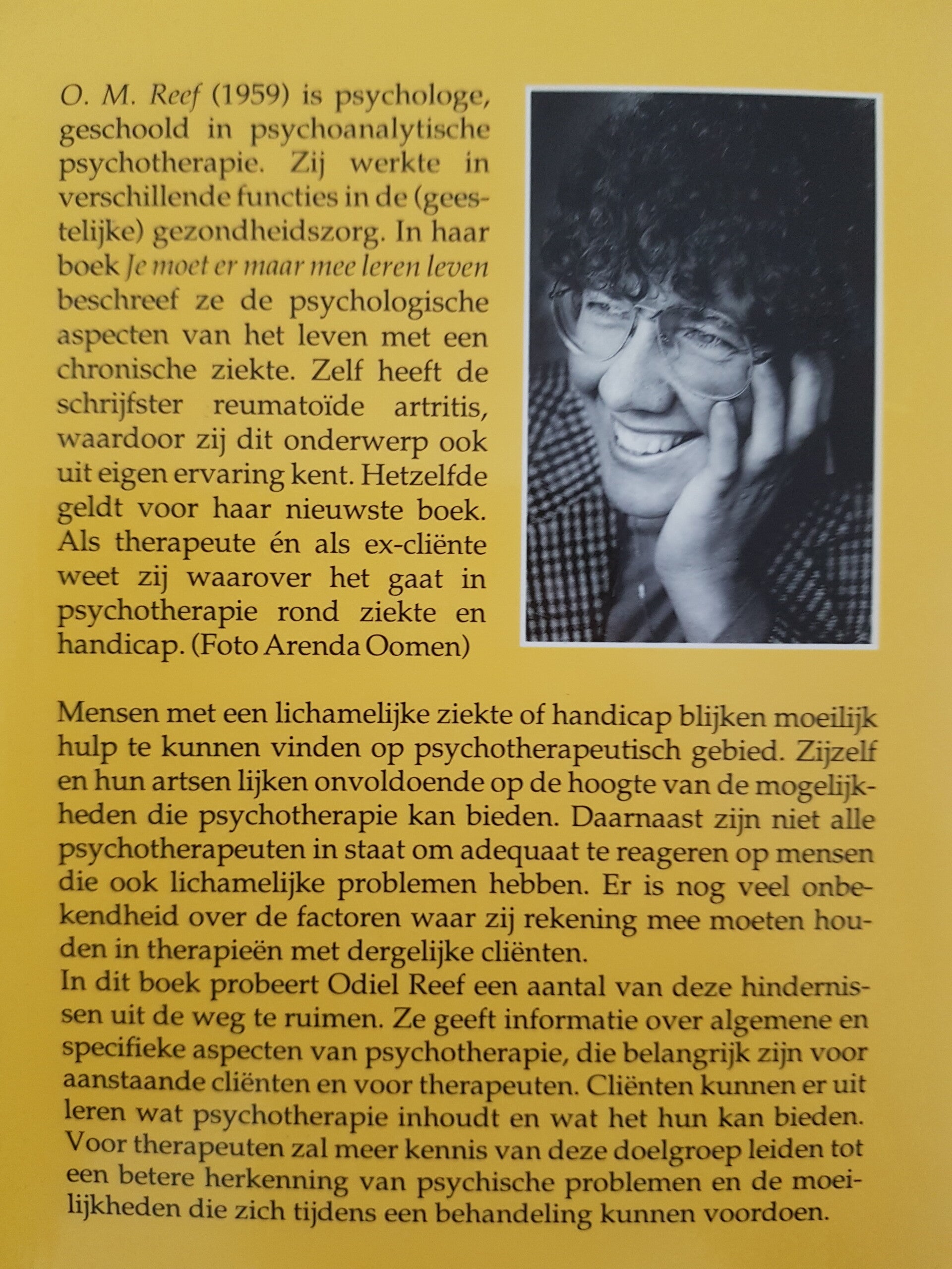 Mensen met een lichamelijke ziekte of handicap blijken moeilijk hulp te kunnen vinden op psychotherapeutisch gebied. Zijzelf en hun artsen lijken onvoldoende op de hoogte van de mogelijkheden die psychotherapie kan bieden. Daarnaast zijn niet alle psychotherapeuten in staat om adequaat te reageren op mensen die ook lichamelijke problemen hebben. Er is nog veel onbekendheid over de factoren waar zij rekening mee moeten houden in therapieën met dergelijke cliënten. In dit boek probeert Odiel Reef een aantal van deze hindernissen uit de weg te ruimen. Ze geeft informatie over algemene en specifieke aspecten van psychotherapie, die belangrijk zijn voor aanstaande cliënten en voor therapeuten. Cliënten kunnen er uit leren wat psychotherapie inhoudt en wat het hun kan bieden. Voor therapeuten zal meer kennis van deze doelgroep leiden tot een betere herkenning van psychische problemen en de moeilijkheden die zich tijdens een behandeling kunnen voordoen.