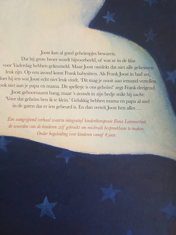 Joost kan al goed geheimpjes bewaren. Dat hij grote broer wordt bijvoorbeeld, of wat ze in de klas voor Vaderdag hebben geknutseld. Maar Joost ontdekt dat niet alle geheimen leuk zijn. Op een avond komt Frank babysitten. Als Frank Joost in bad zet, doet hij iets wat Joost echt niet leuk vindt. 'Dit mag je nooit aan iemand vertellen, ook niet aan je papa en mama. Dit spelletje is ons geheim!' zegt Frank dreigend. Joost gehoorzaamt bang, maar 's avonds in zijn bedje snikt hij zacht: 'Voor dat geheim ben ik te klein.' Gelukkig hebben mama en papa al snel in de gaten dat er iets gebeurd is. En dan vertelt Joost hen alles ...