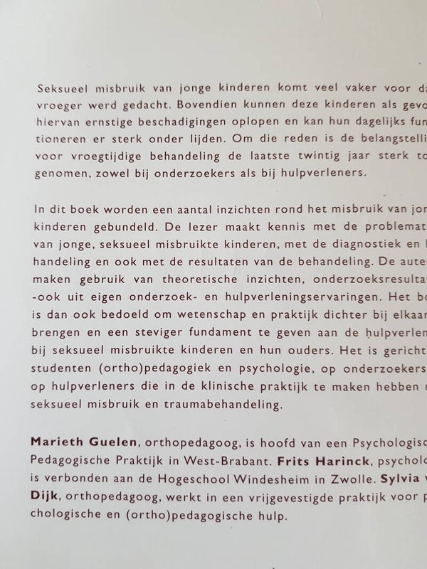 In dit boek worden een aantal inzichten rond het misbruik van jonge kinderen gebundeld. De lezer maakt kennis met de problematiek van jonge, seksueel misbruikte kinderen, met de diagnostiek en behandeling en ook met de resultaten van de behandeling. De auteurs maken gebruik van theoretische inzichten, onderzoeksresultaten -ook uit eigen onderzoek- en hulpverleningser varingen. Het boek is dan ook bedoeld om wetenschap en praktijk dichter bij elkaar te brengen en een steviger fundament te geven aan de hulpverlening bij seksueel misbruikte kinderen en hun ouders. Het is gericht op s tudenten (or tho)pedagogiek en psychologie , op onderzoekers en op hulpverleners die in de klinische praktijk te maken hebben met seksueel misbruik en traumabehandeling.