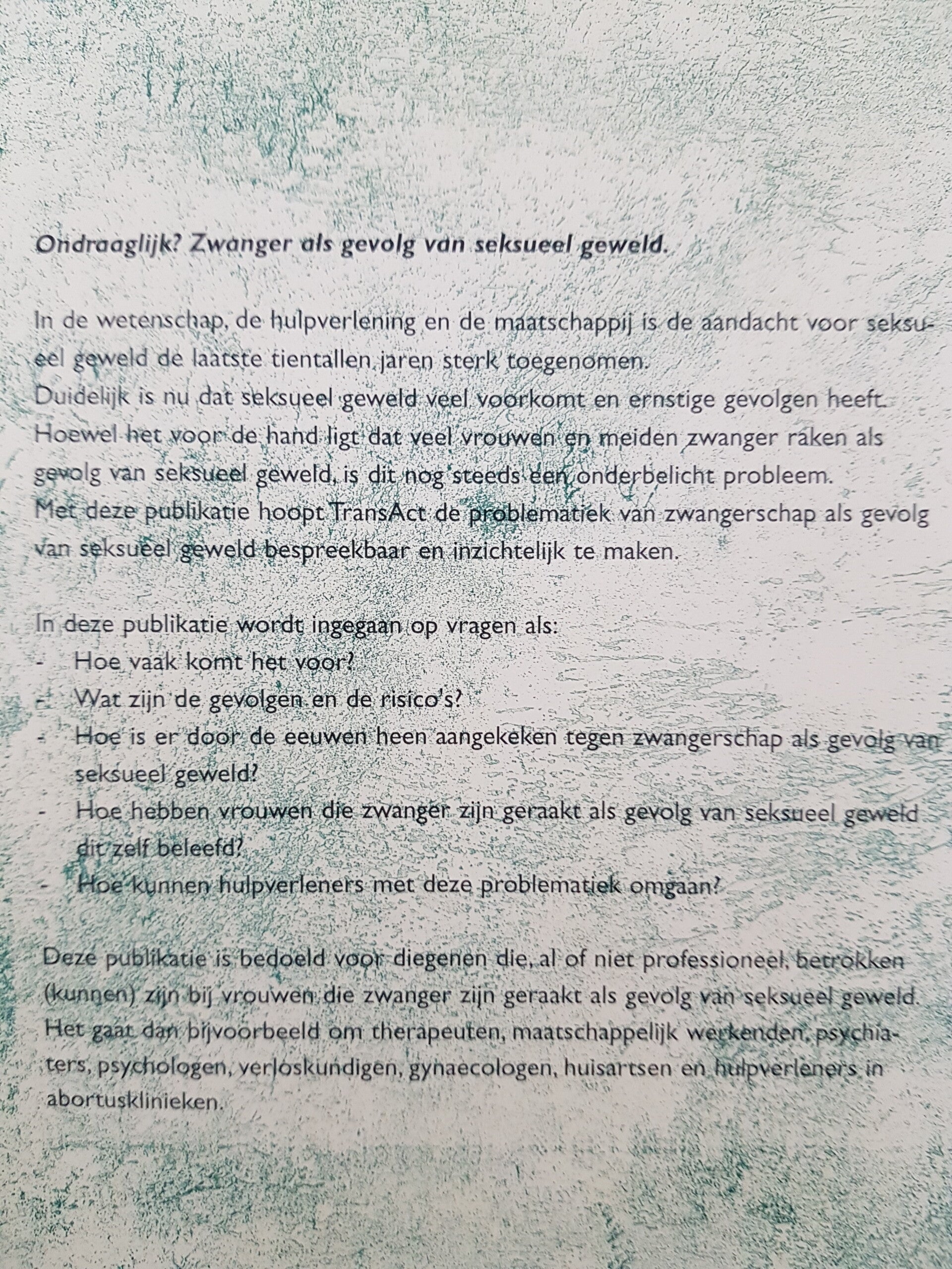 Ondraaglijk, Zwanger als gevolg van seksueel geweld, een uitgave van TransAct