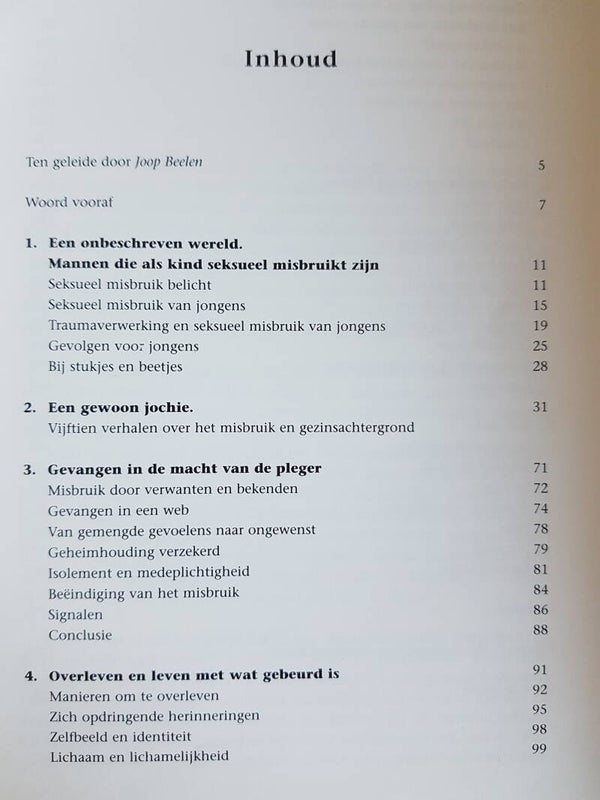 De gevolgen en verwerking van seksueel-misbruikervaringen worden in dit boek geplaatst in het kader van traumaverwerking en mannelijkheidscoderingen. Er wordt ingegaan op de ondersteuning die professionele hulpverlening kan geven en de mogelijkheden en knelpunten van het huidige hulpverleningsaanbod.