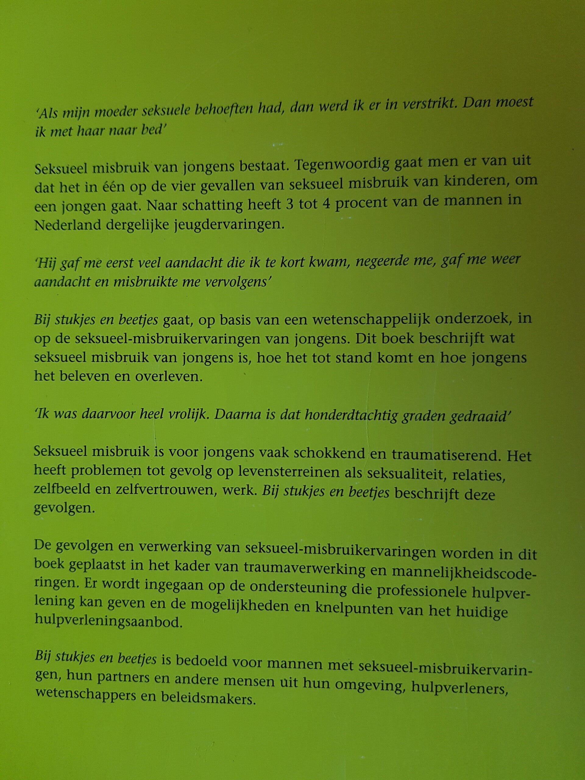 Seksueel misbruik is voor jongens vaak schokkend en traumatiserend. Het heeft problemen tot gevolg op levensterreinen als seksualiteit, relaties, zelfbeeld en zelfvertrouwen, werk. Bij stukjes en beetjes beschrijft deze gevolgen.