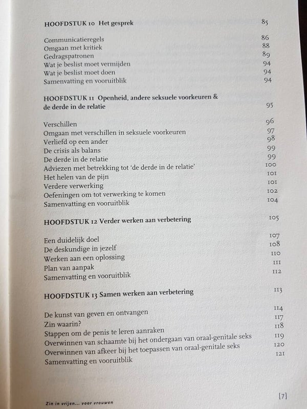Zin in vrijen... voor vrouwen is een handreiking aan iedere vrouw die gemerkt heeft dat de vanzelfsprekende intimiteit met haar geliefde is verdwenen en dat ze nog maar nauwelijks dingen 'samen' doen; die zich ervan bewust is dat ze druk met de kinderen, de familie, vrienden en kennissen in de weer zijn, maar dat ze nooit meer met elkaar in het wilde weg kletsen of tegen elkaar aan liggend televisiekijken.