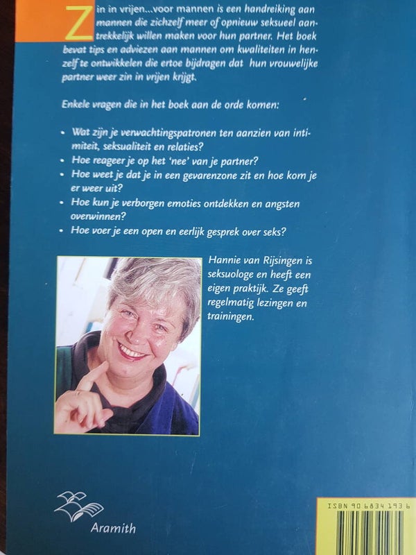 Hannie van Rijsingen Zin in vrijen... voor mannen Wat een man kan doen als hij zin heeft en zij niet Seksuologie Hannie van Rijsingen schreef in 1999 het boekje Zin in vrijen? ? tips voor vrouwen die meer plezier willen ervaren in seks. Zij kreeg opmerkelijk veel reacties van mannen, die vooral vroegen: wat moet ik doen om mijn vrouw te prikkelen? Ik kan doen wat ik wil, maar ze reageert nergens meer op. Kunt u mij alstublieft wat tips geven? Zin in vrijen... voor mannen is daarop het antwoord. Het boek is bestemd voor mannen die zichzelf weer of meer seksueel aantrekkelijk willen maken voor hun vrouw. Tegelijk met dit ?mannenboek? verschijnt een nieuwe, bewerkte editie van het eerste (vrouwen)boek. Beide boeken zijn qua formaat en uitvoering op fraaie wijze aan elkaar gekoppeld. Enkele vragen die in Zin in vrijen... voor mannen aan de orde komen: ? Wat zijn je verwachtingspatronen ten aanzien van intimiteit, seksualiteit en relaties? ? Hoe reageer je op het ?nee? van je partner? ? Hoe weet je dat je in een gevarenzone zit en hoe kom je er weer uit? ? Hoe kun je verborgen emoties ontdekken en angsten overwinnen? ? Hoe voer je een open en eerlijk gesprek over seks? Ca. Euro 14,90 14,5 x 21,5 cm, ca. 144 blz., paperback Omslag Ivar Hamelink Verschijnt oktober 2002 ISBN 90 6834 193 6 NUR 865 aramith hedendaagse onderwerpen