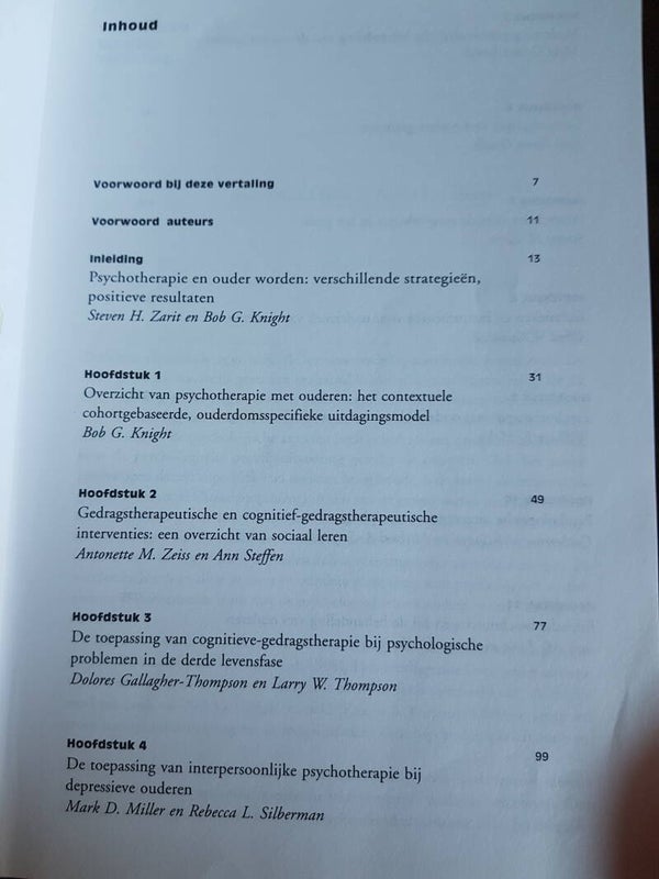 Tot voor kort was het een veel gehoorde opvatting dat ouderen slecht zouden reageren op psychotherapie. Gelukkig is er sinds enige tijd een groeiend besef te ontwaren dat dit geenszins het geval is. Ook dit boek laat zien wat met therapie bij ouderen kan worden bereikt. Met behulp van theorie, onderzoek en case-studies worden de uitdagingen en de voldoening van het effectief kunnen werken met ouderen getoond. Een vijftigtal ervaren therapeuten beschrijft hoe zij succesvol hun gedrags-, cognitieve-, psychoanalistische- en gezinstherapie aanpasten aan de problematiek van de latere levensfasen. De oorspronkelijke Amerikaanse versie van dit boek werd uitgegeven door the American Psychological Association. Redacteur Steven Zarit is hoogleraar gerontologie in zowel Zweden als de U.S.A.