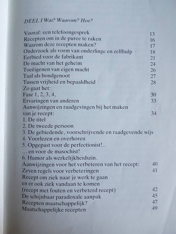 RECEPTEN OM IN DE PUREE TE RAKEN zijn geschreven door mensen die erin zitten, want niemand is deskundiger dan degeen die zijn eigen puree heeft gemaakt. Het is een boekje voor de bereiding van zwarigheden, angstigheden, opgefoktheden. Voor pijnen in het gezin, in de buik, in het bedrijf.