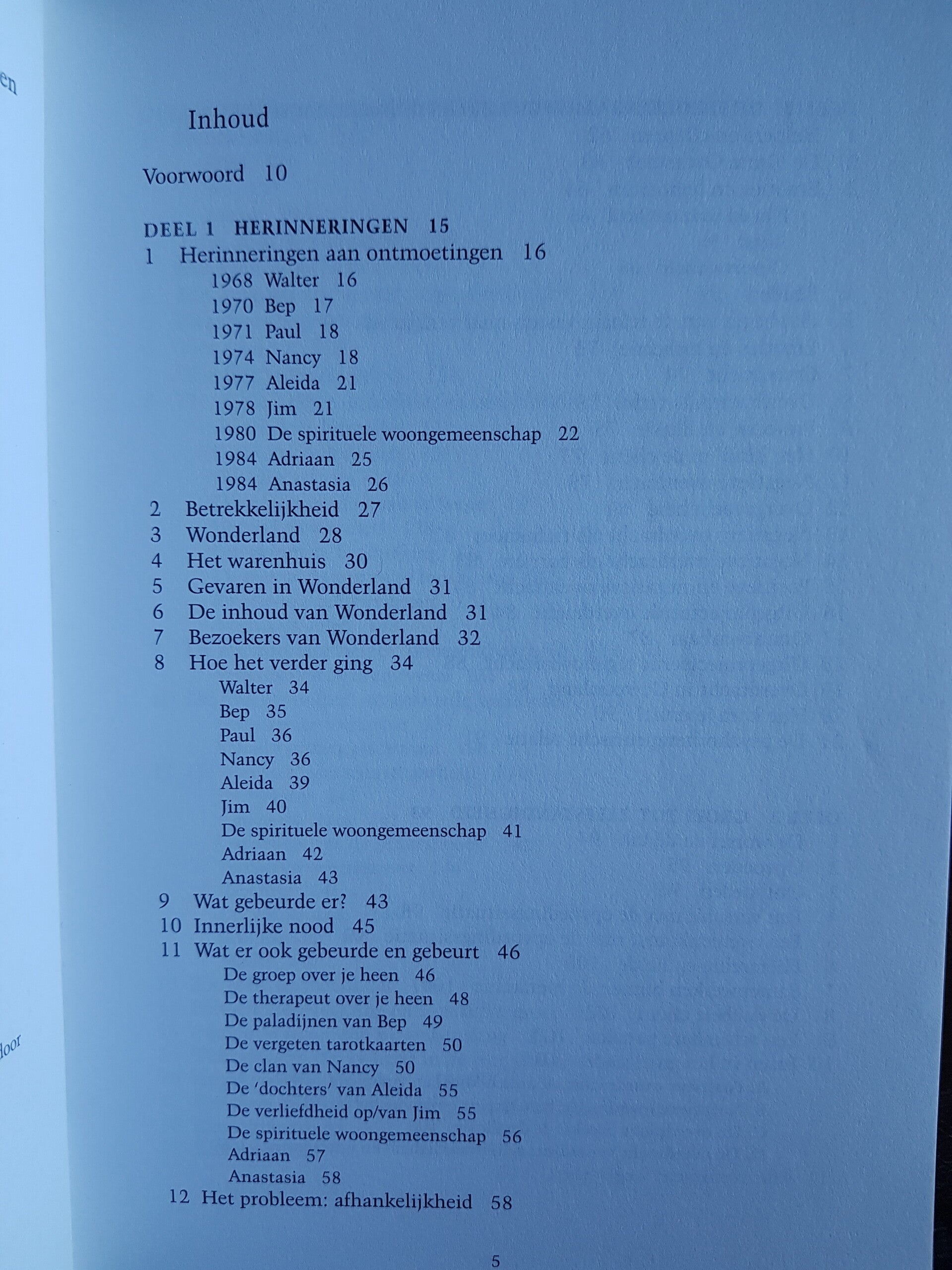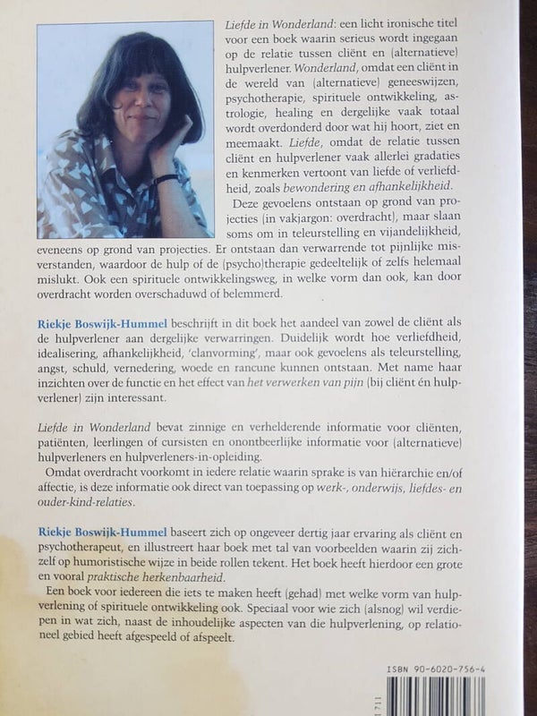 samenvatting: Liefde in Wonderland: een licht ironische titel voor een boek waarin serieus wordt ingegaan op de relatie tussen cliënt en (alternatieve) hulpverlener. Wonderland, omdat een cliënt zich in de wereld van (alternatieve) geneeswijzen, psychotherapie, spirituele ontwikkeling, astrologie, healing en dergelijke vaak totaal overdonderd voelt. Liefde, omdat de relatie tussen cliënt en hulpverlener vaak allerlei gradaties en kenmerken vertoont van liefde of verliefdheid, zoals bewondering en afhankelijkheid. Deze gevoelens ontstaan op grond van overdracht, maar slaan soms om in teleurstelling en vijandelijkheid, met verwarrende tot pijnlijke misverstanden tot gevolg. Zich baserend op ongeveer dertig jaar ervaring als cliënt en therapeut, beschrijft Riekje Boswijk in dit boek het aandeel van zowel de cliënt als de hulpverlener aan dergelijke verwarringen. Het boek is verhelderend voor cliënten, patiënten, leerlingen of cursisten, en onontbeerlijk voor (alternatieve) hulpverleners en hulpverleners-in-opleiding. Omdat overdracht voorkomt in iedere relatie waarin sprake is van hiërarchie en/of affectie, is deze informatie ook direct van toepassing op werk-, onderwijs-, liefdesen ouder-kindrelaties