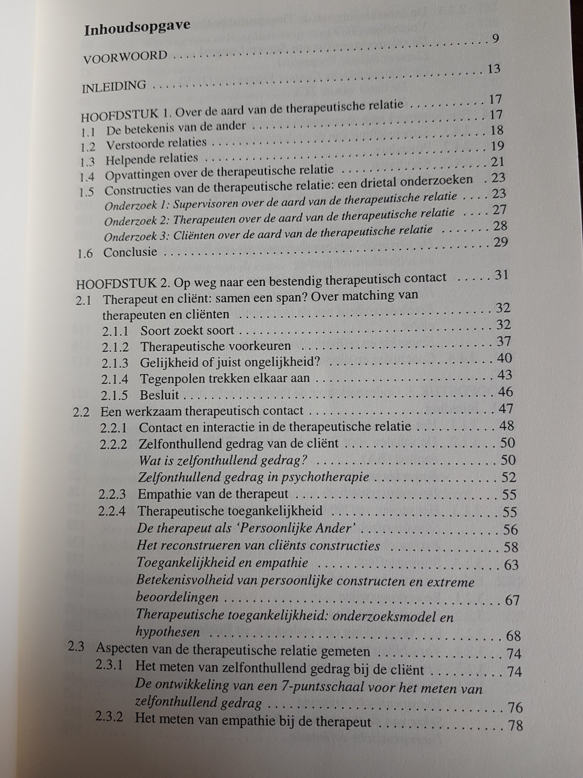 De auteur van dit boek heeft de bijzondere tussenmenselijke betrekking tot onderwerp van studie gemaakt. Allereerst doet hij verslag van onderzoek naar de structuur van de therapeutische relatie. Vervolgens gaat hij in op het aspect van 'therapeutische toegankelijkheid': onder welke voorwaarden zijn cliënten bereid hun therapeut toegang tot hun persoonlijke (belevings)wereld te geven? En, omgekeerd, bij wie lukt het de therapeut (beter) om zich toegang tot de persoonlijke (belevings)wereld van de cliënt te verschaffen? Ten slotte worden enkele onderzoeksbevindingen gerapporteerd over (het verdiepen van) de therapeutische dialoog, met name in beginnende gesprekstherapieën.