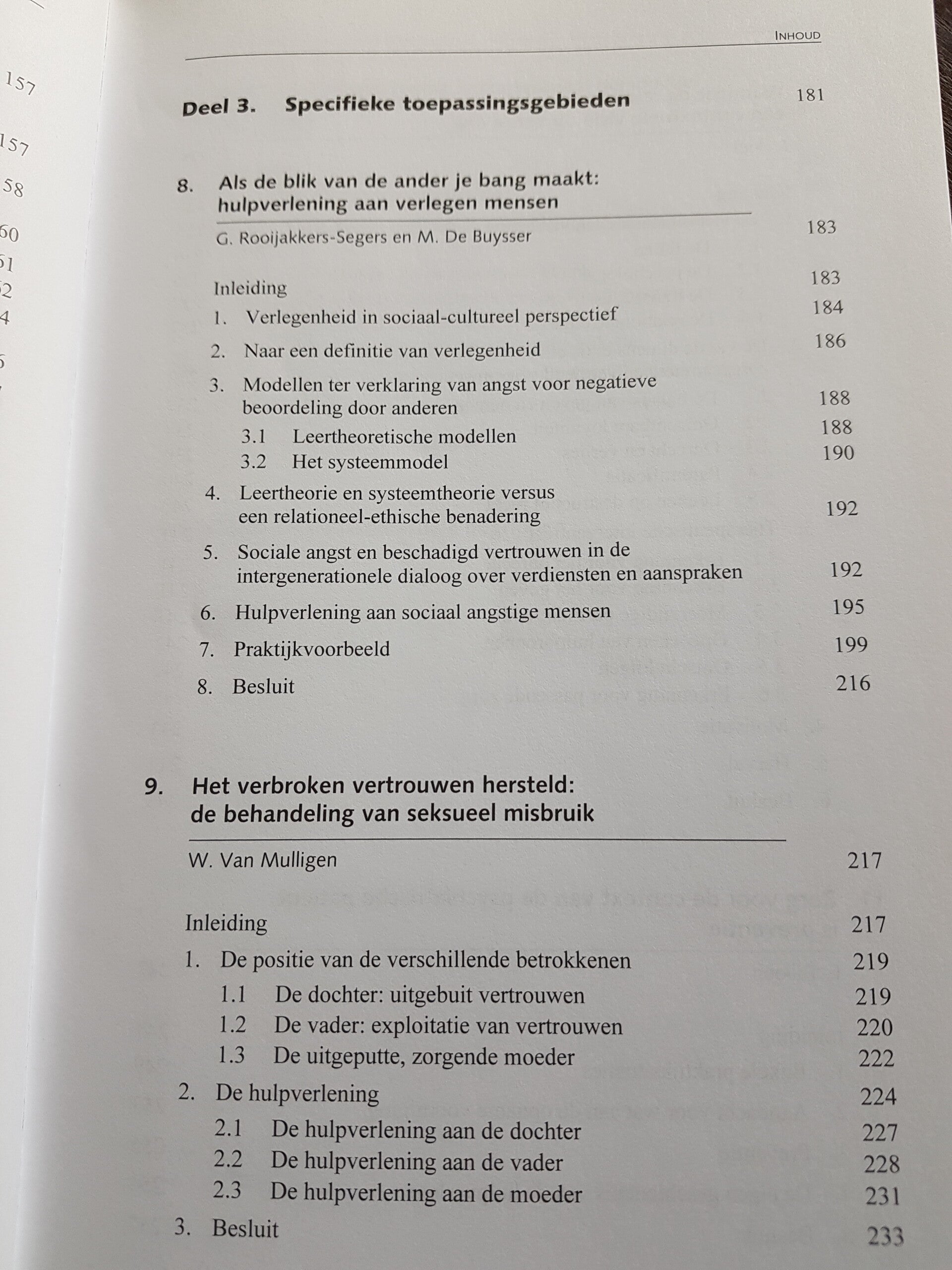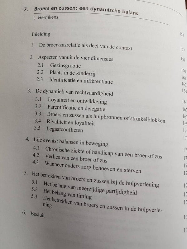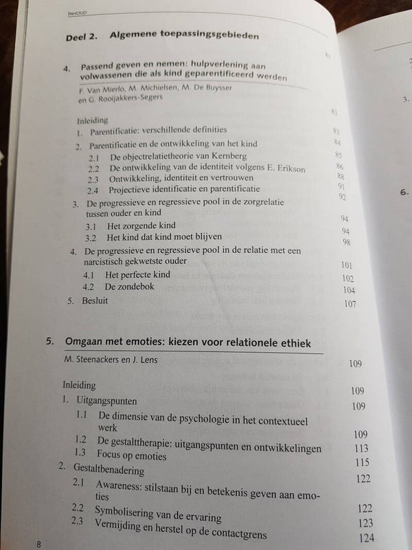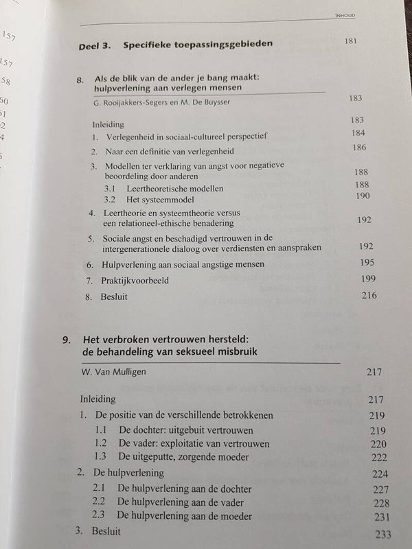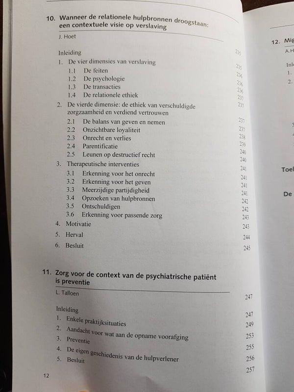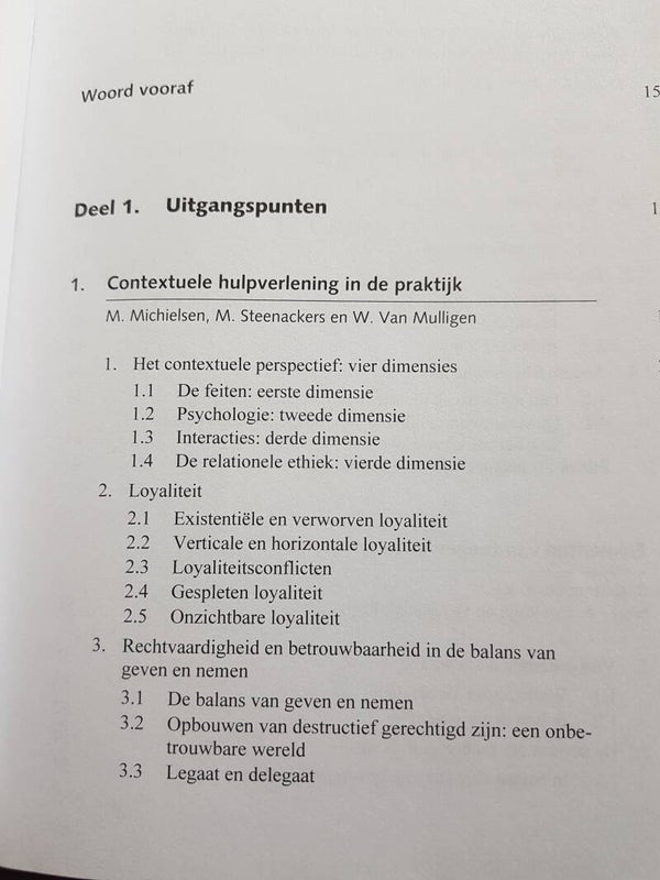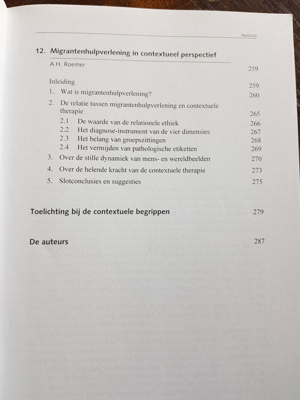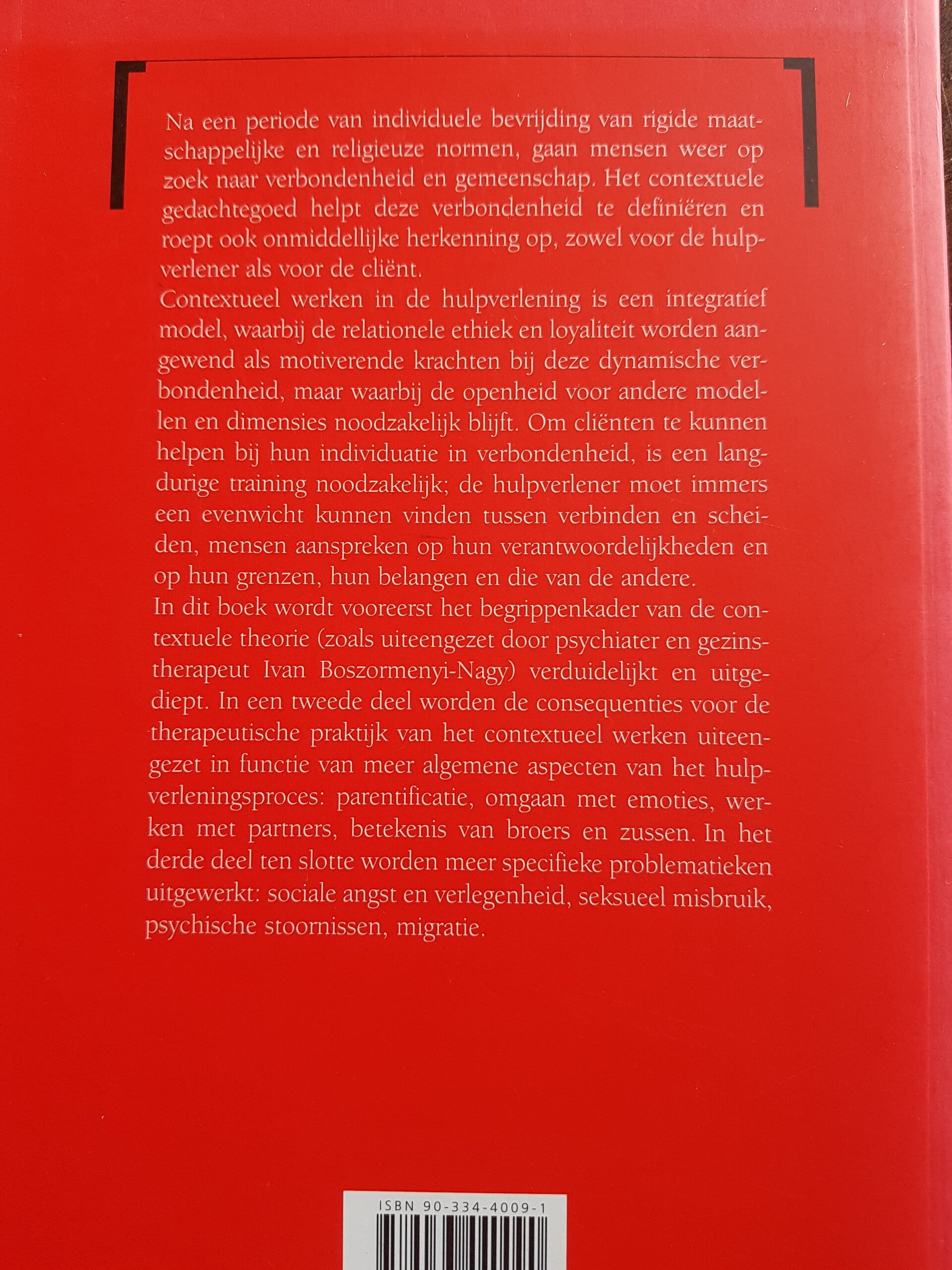 Na een periode van individuele bevrijding van rigide maatschappelijke en religieuze normen, gaan mensen weer op zoek naar verbondenheid en gemeenschap. Het contextuele gedachtegoed helpt deze verbondenheid te definiëren en roept ook onmiddellijke herkenning op, zowel voor de hulpverlener als voor de cliënt. Contextueel werken in de hulpverlening is een integratief model, waarbij de relationele ethiek en loyaliteit worden aangewend als motiverende krachten bij deze dynamische verbondenheid, maar waarbij de openheid voor andere modellen en dimensies noodzakelijk blijft. Om cliënten te kunnen helpen bij hun individuatie in verbondenheid, is een langdurige training noodzakelijk: de hulpverlener moet immers een evenwicht kunnen vinden tussen verbinden en scheiden, mensen aanspreken op hun verantwoordelijkheden en op hun grenzen, hun belangen en die van de andere. In dit boek wordt met name het begrippenkader van de contextuele theorie (zoals uiteengezet door psychiater en gezinstherapeut Ivan Boszormenyi-Nagy) verduidelijkt en uitgediept. In een tweede deel worden de consequenties voor de therapeutische praktijk van het contextueel werken uiteengezet in functie van meer algemene aspecten van het hulpverleningsproces: parentificatie, omgaan met emoties, werken met partners, betekenis van broers en zussen. In het derde deel ten slotte worden meer specifieke problematieken uitgewerkt: sociale angst en verlegenheid, seksueel misbruik, psychische stoornissen, migratie.