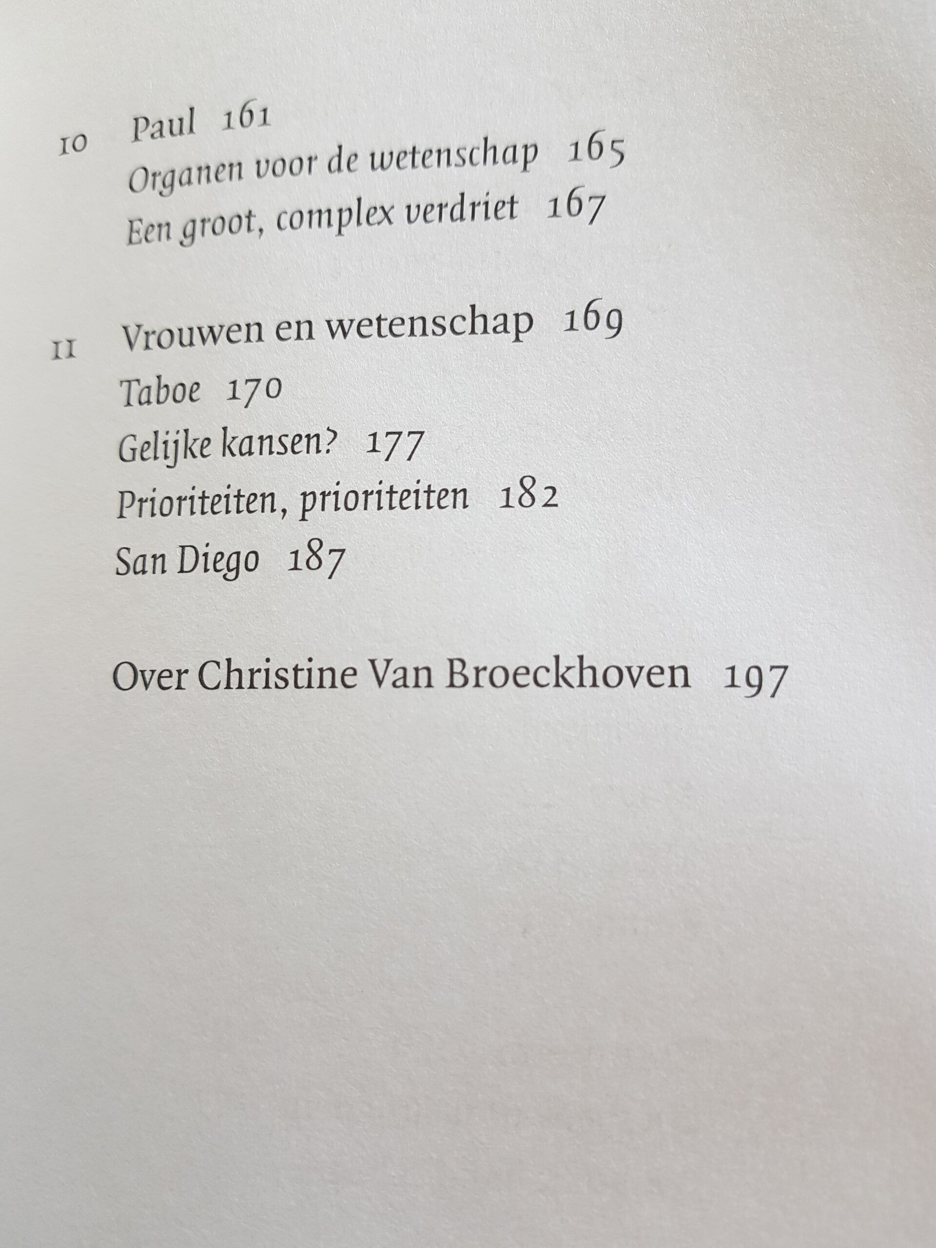 Twee verhaallijnen draaien om elkaar en vormen zo de bouwstenen van een bijzonder boek. Christine Van Broeckhoven vlecht haar persoonlijke ervaringen samen met haar wetenschappelijke bevindingen tot een geheel dat nog het meest lijkt op de DNA-structuren die ze zo lang heeft onderzocht. Voor een vrouw in de door mannen gedomineerde wetenschappelijke wereld is het niet altijd gemakkelijk, maar de passie voor haar vak en vooral haar persoonlijke betrokkenheid bij alzheimer leidden haar naar de top van haar vakgebied.