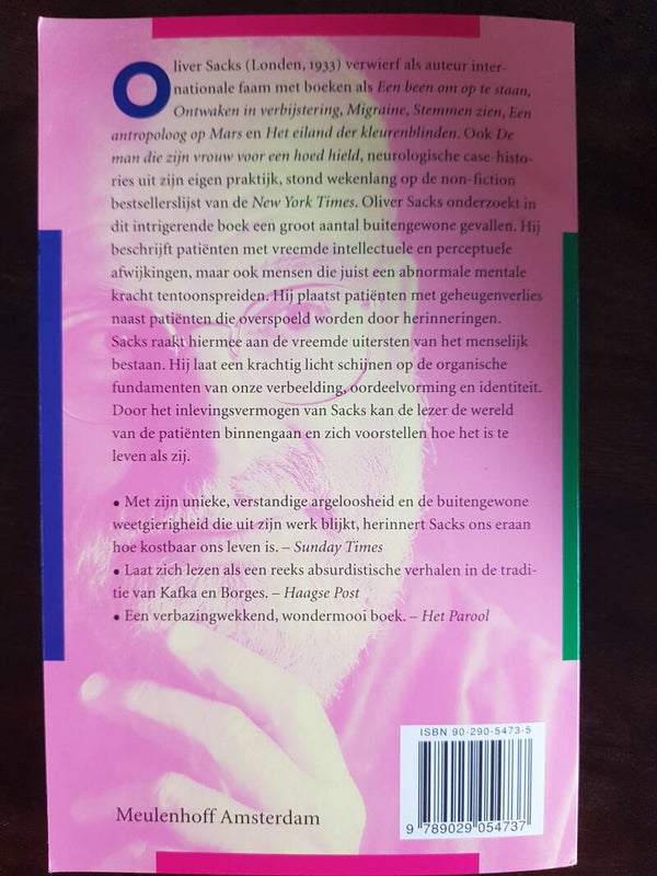 paperback, 261 pagina'sIn De man die zijn vrouw voor een hoed hield vertelt Oliver Sacks de verhalen van mensen die lijden aan perceptuele en intellectuele afwijkingen: patiënten die hun herinneringen kwijt zijn, niet langer in staat zijn om geliefden of alledaagse voorwerpen te herkennen, of patiënten die te maken hebben met tics en die zonder dat te willen obsceniteiten schreeuwen. Hoewel deze gevallen ons vaak bizar voorkomen, worden ze door Sacks’ respectvolle en sympathieke wijze van vertellen diep menselijk. Aan de hand van fascinerende en vaak ontroerende ziektegeschiedenissen laat Sacks zien hoe het is om te moeten leven met een neurologische afwijking.