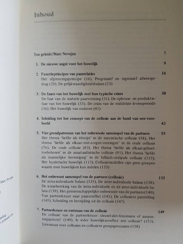 De auteur schrijft over de voor ieder herkenbare aspecten van het huwelijk: over partnerkeuze, de fasen in het huwelijk, de angst voor een te strakke binding, scheiding, verhouding met een derde en lichamelijke verschijnselen tengevolge van huwelijksspanningen. Dit boek onderscheidt zich van de geijkte bestsellers over huwelijk, strijdtechnieken en partnertrainingen, die dikwijls te veel aan de oppervlakte blijven om de gecompliceerde problematiek van twee mensen recht te doen. De auteur reikt geen al te snelle oplossingen, alternatieve gedragswijzen of geprogrammeerde trainingen aan. Dit boek moet al diegenen kunnen helpen die streven naar een verdiept begrip voor elkaar; een begrip dat een huwelijkscrisis niet alleen ziet als een mankement maar als een poging om samen tot werkelijke rijping te komen. De Nederlandse psychiater Mare Nevejan schrijft in zijn voorwoord: 'Een boek als dit dat diep ingaat op de oorzaak van huwelijksproblemen ontbrak tot nu toe. Als vakman beveel ik het van harte aan. Het is een goede zaak dat er een grondig en begrijpelijk boek over de partnerrelatie beschikbaar is. Zowel leek als vakman zullen zich in dit boek herkennen en er hun voordeel mee doen. In het belang van de lezers is zoveel mogelijk afgezien van vakjargon, onvermijdelijke vaktermen worden verduidelijkt en de uiteenzettingen steeds weer geïllustreerd met uit het leven gegrepen voorbeelden.'