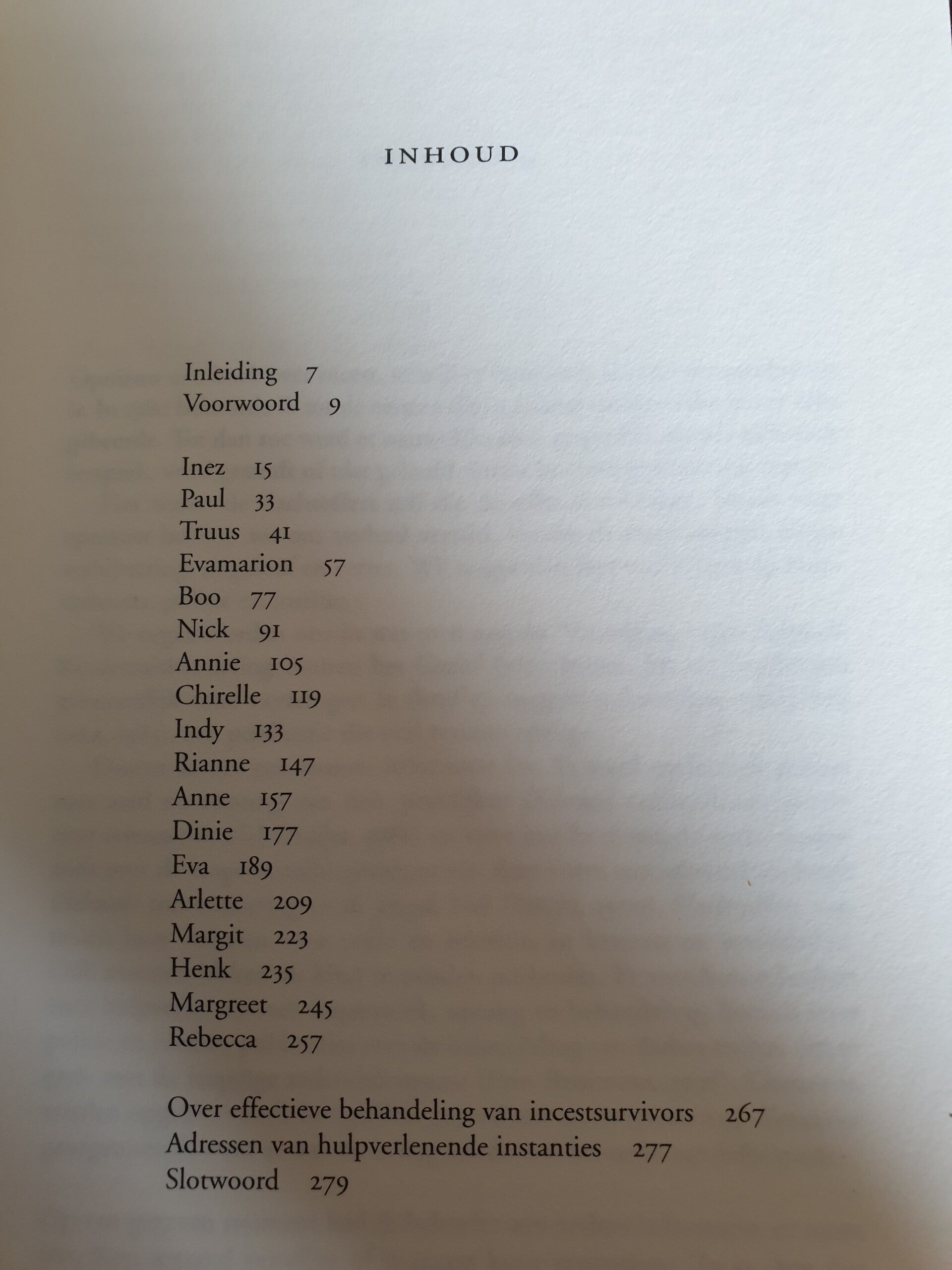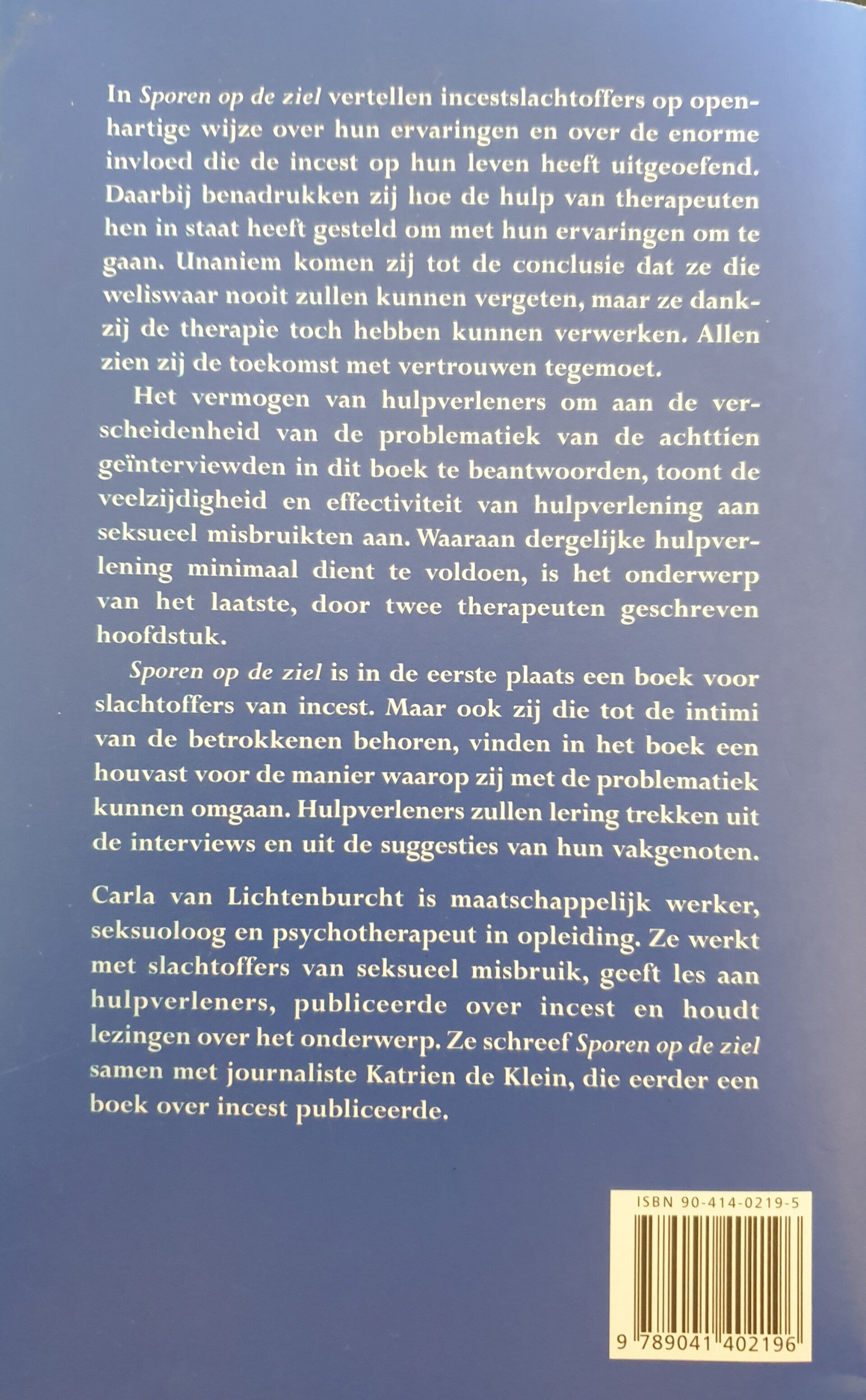 Sporen op de ziel. In Sporen op de ziel vertellen incestslachtoffers op openhartige wijze over hun ervaringen en over de enorme invloed die de incest op hun leven heeft uitgeoefend. Daarbij benadrukken zij hoe de hulp van therapeuten hen in staat heeft gesteld om met hun ervaringen om te gaan. Unaniem komen zij tot de conclusie dat ze dit weliswaar nooit zullen kunnen verwerken. Allen zien zij de toekomst met vertrouwen tegemoet.