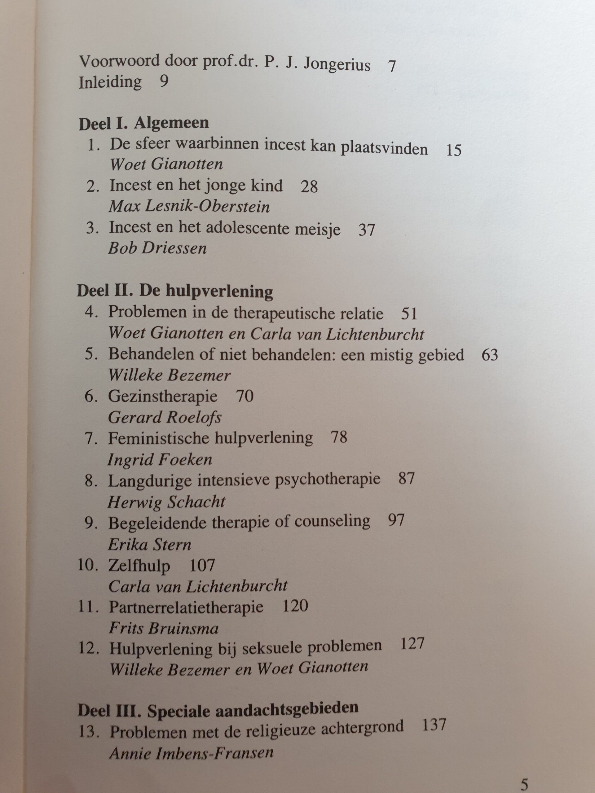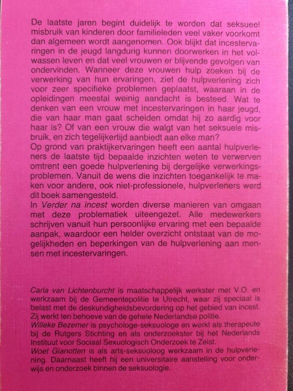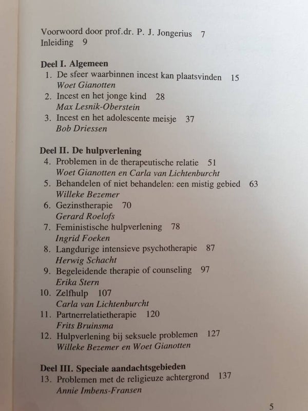 In het eerste gedeelte (pp. 15-50) wordt een beschrijving gegeven van incest. Het tweede en belangrijkste deel toont verschillende mogelijkheden van hulp bij verwerking van incestervaringen. het gaat niet om een weergave van ideale hulpverlening, maar omeen beschrijving van de huidige gang van zaken. Het laatste deel behandelt specifieke problemen die hulpverleners in dit kader kunnen verwachten (pp. 137-170). Dit boek bundelt 16 artikelen, waarvan de auteurs allen praktische ervaring met hulpverlening aan incestslachtoffers hebben. De redaktie is erin geslaagd een helder en informatief boek samen te stellen, dat van groot praktisch nut kan zijn voor iedereen die met incestslachtoffers te maken heeft of kan krijgen.