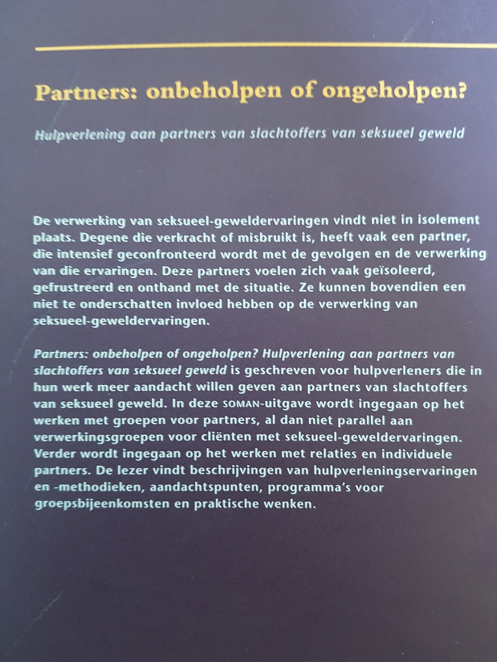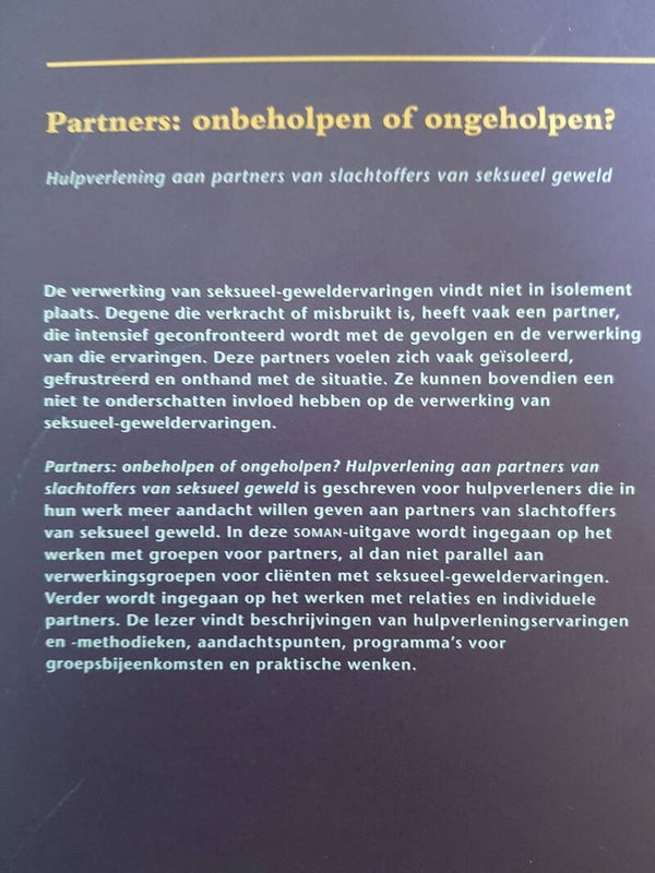 Partners: onbeholpen of ongeholpen? Hulpverlening aan partners van slachtoffers van seksueel geweld is geschreven voor hulpverleners die in hun werk meer aandacht willen geven aan partners van slachtoffers van seksueel geweld. In deze soman-uitgave wordt ingegaan op het werken met groepen voor partners, al dan niet parallel aan verwerkingsgroepen voor cliënten met seksueel-geweldervaringen.