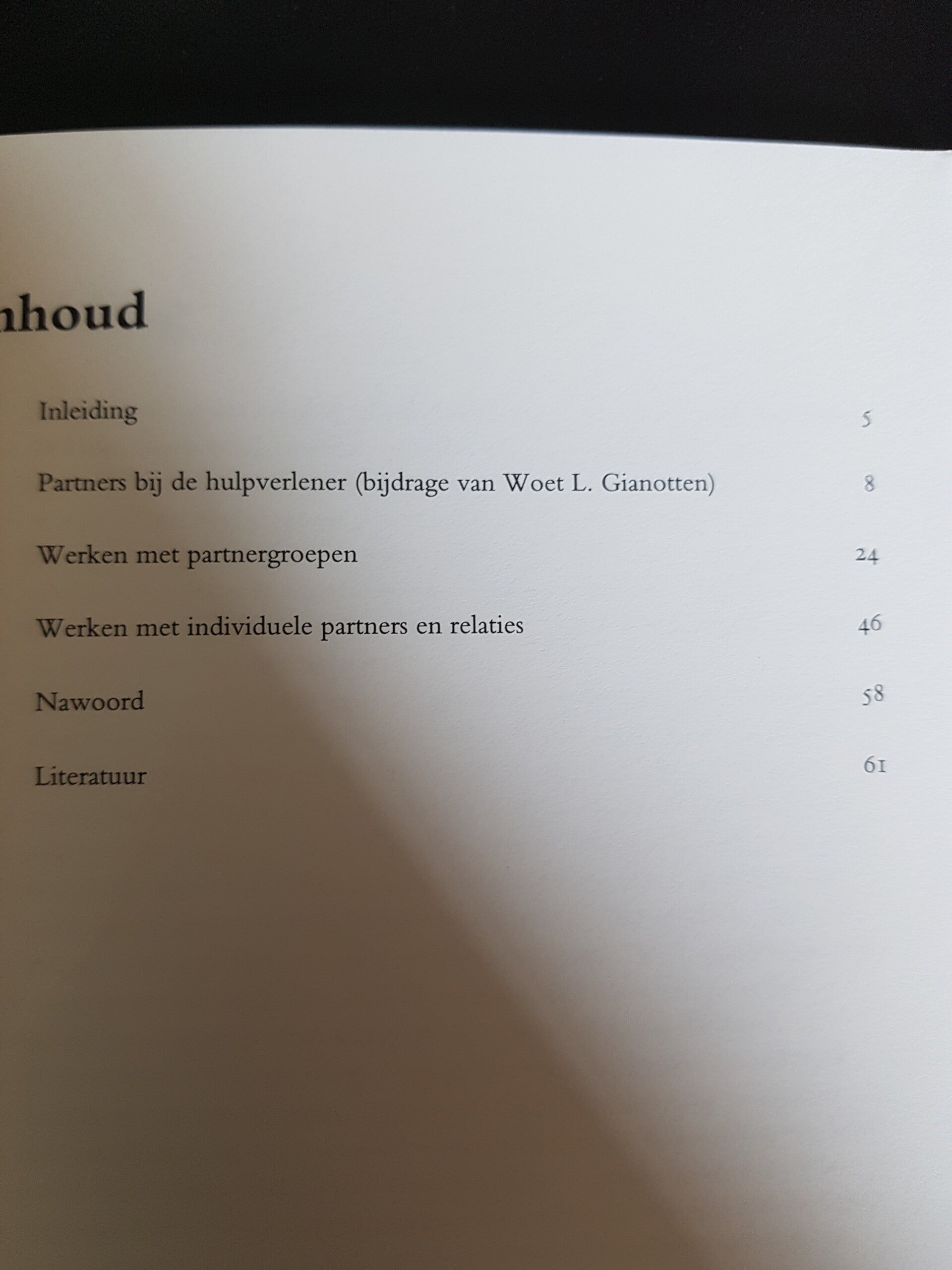 Verder wordt ingegaan op het werken met relaties en individuele partners. De lezer vindt beschrijvingen van hulpverleningservaringen en -methodieken, aandachtspunten, programma's voor groepsbijeenkomsten en praktische wenken.
