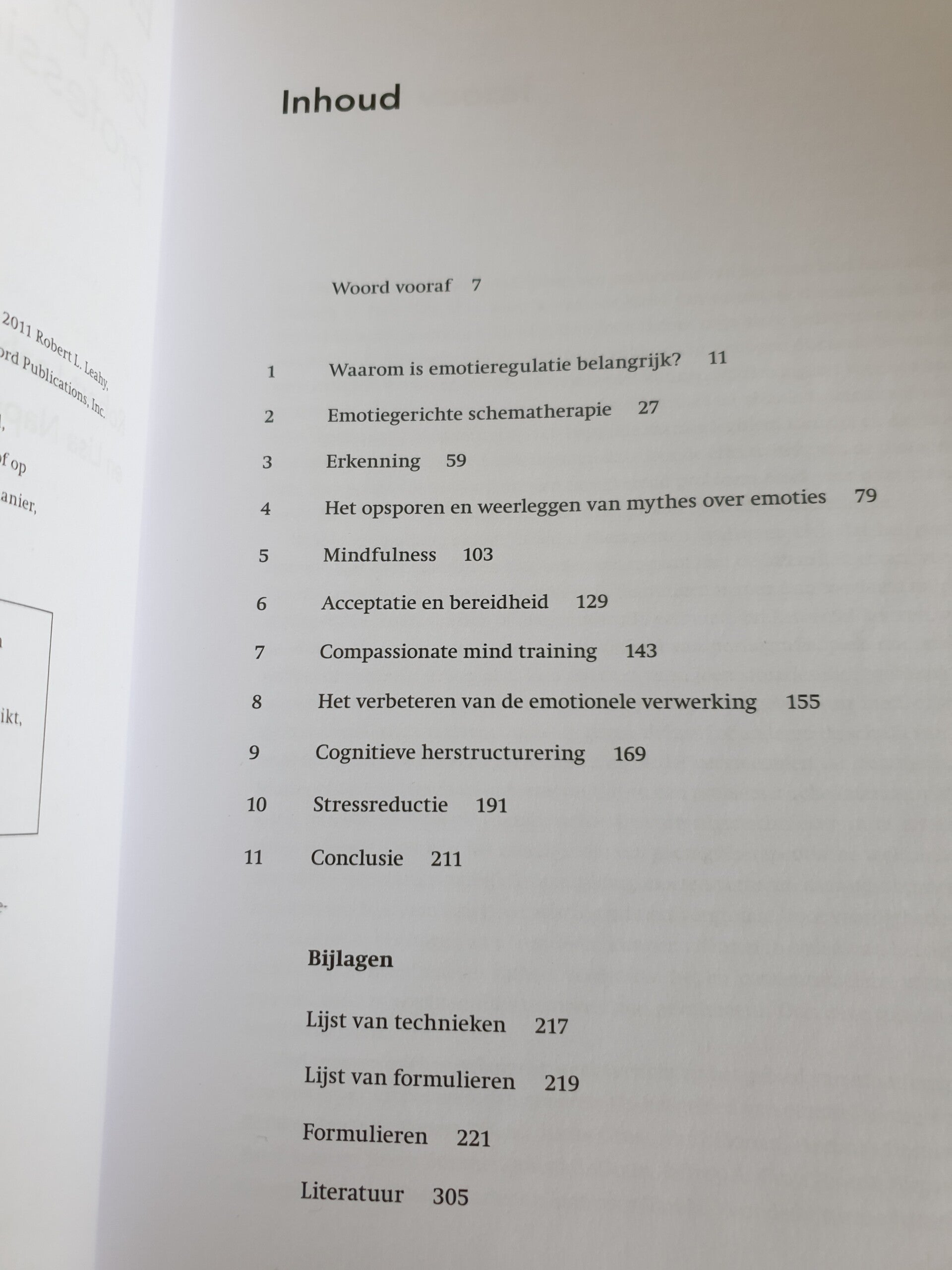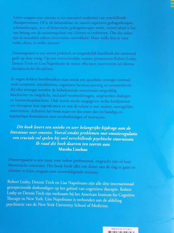 Leren omgaan met emoties is een essentieel onderdeel van verschillende therapievormen. Of je als behandelaar nu vanuit cognitieve gedragstherapie, schematherapie, ACT of dialectische gedragstherapie werkt, vrijwel altijd is het van belang om de emotieregulatie van cliënten te verbeteren. Om die reden zijn er inmiddels talloze interventies ontwikkeld. Maar welke kies je voor welke cliënt, in welke situatie? 'Emotieregulatie' is een uiterst praktisch en toegankelijk handboek dat antwoord geeft op deze vraag. Op een overzichtelijke manier presenteren Robert Leahy, Dennis Tirch en Lisa Napolitano de meest effectieve interventies uit diverse therapeutische disciplines. In negen heldere hoofdstukken staat steeds een specifieke strategie centraal, zoals acceptatie, mindfulness, cognitieve herstructurering en stressreductie. Bij elke strategie worden de bijbehorende interventies zorgvuldig beschreven en toegelicht, inclusief voorbeeldvragen, uitgewerkte dialogen en huiswerkopdrachten. Ook wordt steeds aangegeven welke knelpunten een therapeut kan tegenkomen en wat de relatie is met andere, soortgelijke interventies. Achterin het boek staat tot slot meer dan 60 handige en kopieerbare formulieren met invuloefeningen of instructies. "Dit boek levert een unieke en zeer belangrijke bijdrage aan de literatuur over emoties. Vooral omdat problemen met emotieregulatie een cruciale rol spelen bij veel verschillende psychische stoornissen. Ik raad dit boek daarom ten zeerste aan" -- Marsha Linehan 'Emotieregulatie' is een must voor iedere professional, ongeacht zijn of haar theoretische oriëntatie. Het boek biedt alles om direct aan de slag te gaan en cliënten te leren omgaan met overweldigende emoties. Robert Leahy, Dennis Tirch en Lisa Napolitano zijn alle drie internationaal gerespecteerde deskundigen op het gebied van cognitieve therapie. Robert Leahy en Dennis Tirch zijn werkzaam bij het American Institute for Cognitive Therapy in New York. Lisa Napolitano is verbonden aan de afdeling psychiatrie van de New York University School of Me